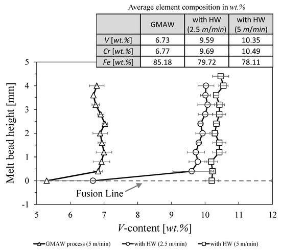 An XRF element scan was performed at the cross section along the melt bead height, according to Section 2.3, to determine the influence of the decreasing dilution rate, A, on the chemical composition of the hardfacing. Figure 6 shows that the dilution has an immediate influence on the element composition. The average percentage of V and Cr increases from ~6 to ~10 wt.%. Furthermore, the element distribution, displayed in the example of V, is uniform along the melt bead height. Because of the increase in the amount of carbide-forming elements, a change in the microstructural properties is expected.