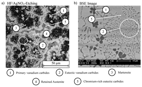 Complementary investigations were performed by means of BSE imaging and EDX. Figure 7b shows that all microstructural features are in accordance with the light microscopic observations. The detected element composition of the different phases is listed in Table 2. Position 1 shows the highest V-content of ~62 wt.%; see Table 2 (Pos. 1). This affirms the precipitation of primary VCs with an average size of 4 µm; see Figure 7b (Pos. 1). The eutectic VCs are characterised by an element contrast comparable with the primary precipitates and exhibit a lamellar solidification structure; see Figure 7b (Pos. 2). The corresponding V-content of ~8.5 wt.% is comparatively small because of the influence of adjacent phases during EDX measurements; see Table 2 (Pos. 2). Cr-rich carbides show the highest amount of detected Cr (~20 wt.%)—see Table 2 (Pos. 5)—and display a fine lamellar eutectic microstructure; see Figure 7b (Pos. 5). BSE images and EDX analyses were not able to differentiate between martensite and retained austenite.