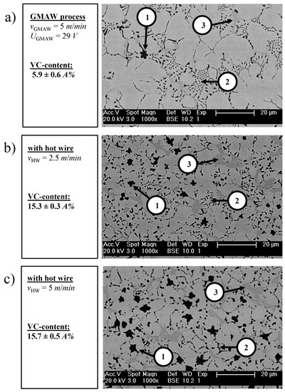 Influence of an additional hot wire on the microstructural properties; primary vanadium carbides (VCs) (1), eutectic VCs (2), and eutectic Cr-rich carbides (3). (a) Microstructure of conventional GMAW (vGMAW = 5 m/min) with a primary VC-content of 5.9 A%, (b) by applying an additional hot wire (vHW = 2,5 m/min), the amount of primary VCs increased to 15.3 A%, (c) by applying an additional hot wire (vHW = 5 m/min), the amount of primary VCs increased to 15.7 A%.