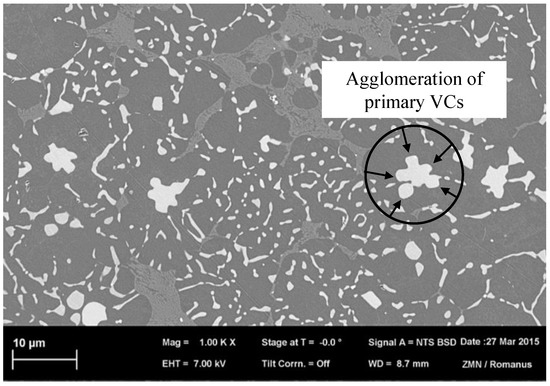 The increasing VC content directly corresponds to a grain refinement of the matrix material as well as increase in the size of the primary VC; see Figure 8a–c. Hereby, BSE images show that the last-named effect is due to a star-like agglomeration of VCs in the melt; see Figure 9.