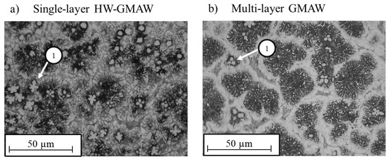 A further microstructural particularity of the single-layer HW-GMAW hardfacing is the increased size of primary VC compared with multi-layer GMAW welding; compare Figure 10a,b. This is due to agglomerations (see Figure 9), whereby the effect cannot be simply explained by a decrease in dilution and heterogeneous nucleation. It is known that the melt bead size and length increase by inserting an additional hot wire in the GMAW melt pool [22]. Consequently, primary VCs are provided more time for the diffusion processes in the melt, promoting the agglomeration of these precipitates.