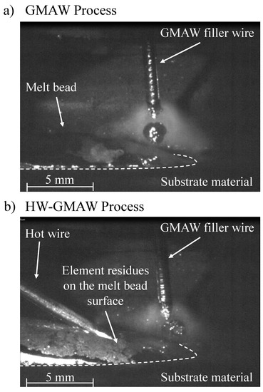 Appearance of element residues on the melt bead surface due to hot wire application during GMAW. (a) Melt bead formation during GMAW (b) HW-GMAW reveals residues on the melt bead surface.