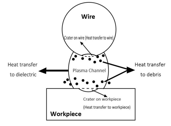 In the last few years, Wire Electrical Discharge Machining (WEDM) has played an important role in the field of advanced machining. Whether in the aerospace or the automatic machining sector, with greater flexibility and high machining accuracy, WEDM can satisfy most processing requirements while also considerably lowering costs. Therefore, to further master this advanced machining technology, more and more studies have been conducted to gain a more in-depth understanding of the WEDM process. As a kind of electro-erosion machining method, the WEDM system involves two electrodes—usually a metal wire (Cathode) and a conductive workpiece (Anode). Figure 1 briefly shows the working principle. The WEDM process is generally performed under immersion in deionized water, oil, or kerosene [1]. While machining is in process, a high number of discharges are generated between the surfaces of the two electrodes. By means of transfer through the plasma channel, a certain part of the heat is partitioned within the workpiece to achieve the objective of material removal. At the same time, the deionized water plays an important role not only in achieving plasma channel but also in cooling the working area and clearing away the debris. In addition, Figure 2 illustrates the plasma channel and it explained that the major heat source has transferred into four parts. They are, respectively, wire, workpiece, debris, and dielectric. The percentage of heat transfer from plasma channel to each part is called as heat partition.