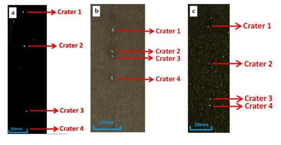 A Leica DCM3D profilometer (Leica Camera AG, Wetzlar, Germany) was used to observe and measure the different dimensions. Figure 5a clearly shows a single crater on the flat surface, and the profile of the crater shows round-like. Therefore, every crater can be approximately done analogy as a circle contour. For further defining of the crater radius (rc), ImageJ (Version 2, ImageJ, Stapleton, New York, NY, USA) is used for outline the precise crater contour and the area is also calculated automatically by the same software (Figure 5b). Based on that, rc of each crater can be obtained and the average value is shown in Table 4. In addition, it is also possible to establish crater depth (dc) by Leica DCM3D as shown in Figure 5c. With that, assuming that the shape of the crater is a spherical cap, the crater volume (vc) can be calculated (Table 4).