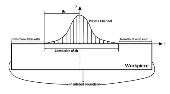 The boundary conditions change over time in the discharge process. First, during the on-time, heat is transferred through the plasma channel. Equation (5) expresses this part of the problem mathematically. As presented in the work of Kitamura et al. [18], although the entire machining process is carried out in a tank filled with dielectric water, the gap between wire and workpiece is almost completely occupied by air bubbles. Therefore, air convection will be used in the simulation of the internal part of plasma channel during pulse on time. For the remaining part that is outside of the plasma channel, the convection of forced deionized water is used. Furthermore, the off-time is as much as 5 times longer than the on-time in this phase, with convection of forced deionized water acting on the entire modeling area. As described in the assumptions presented previously, the influence of heat loss due to radiation can be ignored. Equation (6) expresses heat transfer by convection, where Kt is the thermal conductivity, h is the convection transfer coefficient (which depends on the described boundary conditions) and T0 is the initial temperature.