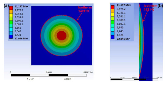 One of the simulation results of the thermal modeling of the crater: (a) Front view and (b) lateral view.