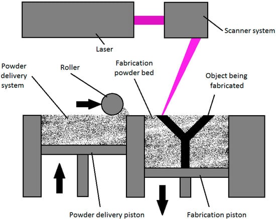 Metal powders are usually fed by a powder spreading or powder feeding system. For the powder spreading method, a straight blade travels in parallel with the substrate to spread a thin powder layer, and the laser beam scans the powder in the powder bed to selectively sinter the solid powder material to form a layer of the part. The final properties and accuracy of the manufactured component are highly dependent on the quality of the single powder layers [9,10,11,12,13]. The packing density, surface uniformity, and effective thermal/mechanical properties are important factors that affect the packing quality of the powder layer. For example, in SLM, a smoother and homogeneous powder layer makes the powder melting more stable and the final quality of the manufactured component better. Moreover, it can be found that the higher the packing density, the better the performance of the final parts. The quality of the thin layer of powder is related to the process parameters, including the powder size distribution, powder spreading speed, layer thickness, and scraper geometry [14,15]. In this paper, we focus on the packing density of the powder bed in SLM, which is shown in Figure 1. From this figure, it can be observed that the characteristics of the powder bed are related to the powder delivery system. Thus, it is important to analyze the packing density of the powder delivery system.