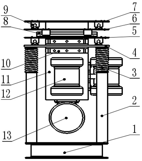 Based on stability considerations, an I-shaped steel structure was selected for the base of the test rig to ensure the stability and flatness of the base. A two-dimensional front view of the experimental test rig is shown in Figure 2. The components mainly include a base (1), support column (2), shock-absorbing spring (3), bottom plate (4), third table from the top (5), upper second table (6), top table (7), sliding block (8), sliding rail (9), rib board (10), middle column (11), X,Y direction 1.5–2 vibration motor (12), and Z-direction 5–4 vibration motor (13). Other auxiliary devices and equipment include frequency converters, air switches, and organic glass containers.