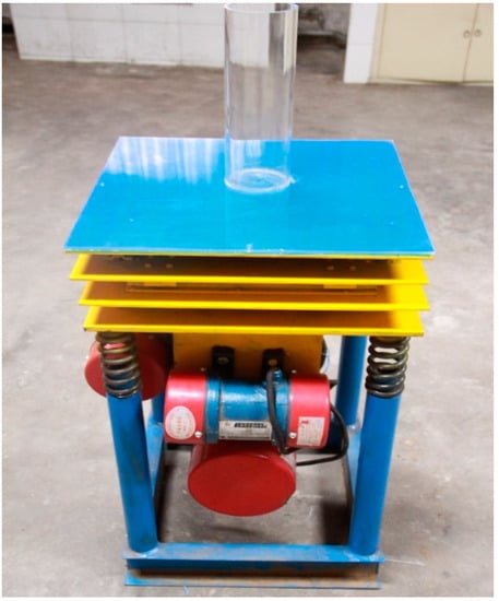 Before the experiment, the position of the built-in eccentric block in the 1.5–2 vibration motor and 5–4 vibration motor was firstly adjusted to determine the magnitude of the vibration amplitude, and the output frequency of the vibration motor was adjusted by the frequency converter. Secondly, the particle container was fixed to be vibrated. After loading the material, the height of the material in the container was measured. Finally, the vertical edges of each layer of the vibrating table were aligned to ensure that the vibration started from the geometric center of the plate surface, making the working process stable and reliable.