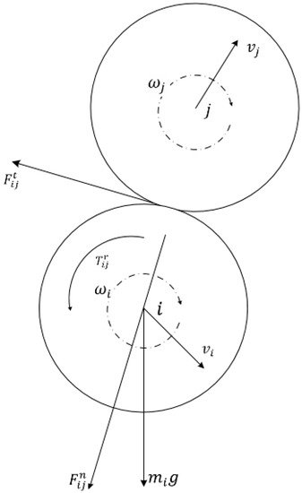 In the simulation, a powder has two types of motion, which are shown in Figure 4, namely, translation and rotation. These two motions can be expressed by Newton’s second law as follows.