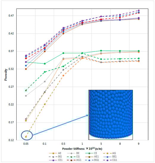 As is well known, the theoretical packing density of mono-size particles is 0.64. The calculated packing density of mono-size 300 μm powders was 0.63, which was consistent with the physical experimental results obtained by Scott, indicating that the numerical model is rational and feasible. The effect of the powder stiffness on the packing porosity for particles with a single size and particles with a normal size distribution is shown in Figure 4. It can be seen from the figure that with an increase in the particle stiffness coefficient, the particle porosity first increases obviously and then gradually stabilizes after the stiffness coefficient increases to n/m. When the stiffness coefficient is less than n/m, there is a large overlap between the particles in contact with each other. As the stiffness increases, the overlap decreases rapidly, so the porosity between the particles increases rapidly. When the stiffness coefficient exceeds n/m, there is a small amount of overlap between the particles in contact with each other. As the stiffness increases, the overlap amount is not significantly reduced, so the porosity between the particles remains basically stable. The stable value of porosity at different depths was compared and analyzed. As the packing depth increases, the stable value of porosity gradually decreases because the gravity of the upper layer particles makes the strain between the lower layer particles relatively large; the amount of overlap at the contact points of the lower layer particles is increased, thereby reducing the porosity.