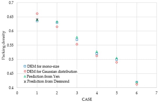 In order to validate the DEM method for fine powders, comparison with the prediction from Yen [33] and Desmond [34] was implemented, which is shown in Figure 6. Yen conducted research on the packing density of mono-size powders. Desmond predicted the packing density of powders with a Gaussian distribution with a particle size greater than 100 μm under different variances. It can be seen from CASE 1 that the predicted packing densities with several methods for larger particle size powders are close to the theoretical value of 0.64. It can also be found from the prediction of CASE 2–CASE 6 that the method proposed in this paper is basically consistent with Yen’s prediction. The packing density of fine particles with a Gaussian distribution is lower than the case of mono-size. For the packing density of fine powders of 100 μm or less, the force between the powders (van der Waals forces and electrostatic attraction) plays a very important role.