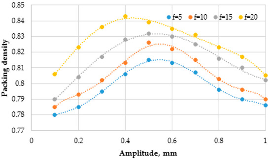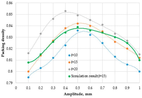 Firstly, a three-dimensional vibration test was performed on stainless steel powder with a Gaussian distribution, an average particle diameter of 300 μm, and a standard deviation of 0.2. The experimental results at different amplitudes and different frequencies are shown in Figure 7. It can be seen from Figure 7 that the change trend of the powder packing density under different vibration conditions was consistent, but as the amplitude increased, the frequency for obtaining the maximum density decreased. This also shows that at larger amplitudes, lower frequencies are required to obtain the maximum density. The same conclusion can be obtained from the simulation result calculated with the simulation model established in Section 3.