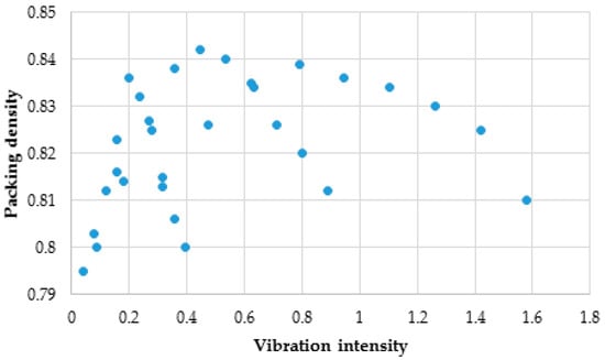 Regardless of the influence of the vibration frequency or amplitude, according to the definition of vibration intensity, the factors are all attributed to the effect of the vibration intensity. Modifying the amplitude or vibration frequency can change the intensity of the vibration, thereby changing the energy input into the stacked powders. At each amplitude, the packing density of the powders first increases with an increase in the vibration intensity, and after reaching the maximum value, it decreases with a further increase in the vibration intensity. In the initial stage, the increase in vibration intensity increases the vibration energy transmitted between the stacked powders, which can effectively fill the porous structure formed in the initial pile. At the same time, it can release the lock between the powders and accelerate the particle partial rearrangement of the space, which can promote the process of densification. However, the experiment found that the vibration intensity cannot be too high, because a too-large intensity will cause the excessive excitation of the stacked powders, which will destroy the dense structure that has been formed, and reduce the packing density. In addition, from Figure 9, we also found that different packing densities are obtained at the same vibration intensity, and the same packing density can correspond to a different vibration intensity. Therefore, characterizing the packing densification that has formed should not only be based on a single vibration intensity, and the impact of the amplitude and vibration frequency should be considered separately.