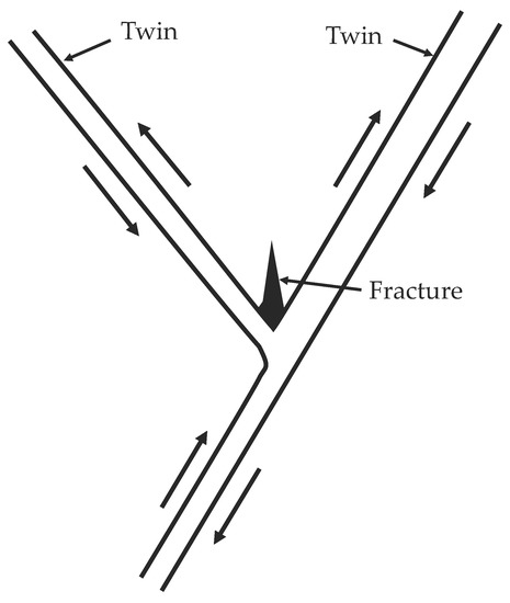 Accommodation effects by slip and kinking are of considerable importance to understand strain incompatibility induced by twinning. While kinking arises in the case where the twin emerges at the free surface, for example, single crystals, accommodation in polycrystals are mainly facilitated by means of a slip or another twin (interaction twins). If a GB has a low misorientation allowing the adjacent grain to have a high local resolved shear stress from the stress concentration ahead of shooting twin, twinning can be readily activated in the adjacent grain [8]. This is a particular case for sharp textures where twins could be observed traversing across multiple grains from one edge to another edge [9,10,11]. However, if the GB has a sufficiently high misorientation leading to a low local Schmid factor for twinning in the adjacent grain, which could arise in weak textures, slip is necessary or otherwise a crack may nucleate to drive fracture [12,13,14]. Crack nucleation at the termination of an incident twin meeting an obstacle twin has been actually reported as early as 1868 by Rose [15], who described “Rose channels”, or voids, formed by intersecting twins in calcite. These were later described by Priestner [16] as microcracks in body-centered cubic (BCC) metals (Figure 1), and by Sleeswyk [17,18,19] to explain ductile–brittle fracture transition in BCC iron through a complex emissary dislocation proposed mechanism. Twin-accommodation effects at GBs and twin boundaries (TBs) bear critical implications for damage initiation in HCP structures [20]. Recently, Zhang et al. [4] showed via molecular dynamics (MD) simulations that the openings of cracks in BCC crystal molybdenum at a GB into which a deformation twin impinges (Figure 2).