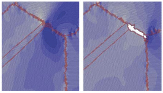 Twin–grain boundary (GB) interaction-induced regions of high stress (dark blue regions) leading to GB crack initiation in Mo according to molecular dynamics (MD) simulation by Zhang et al. [4] (with the permission of Elsevier, 2020). (Each pixelated dot represents an atom).