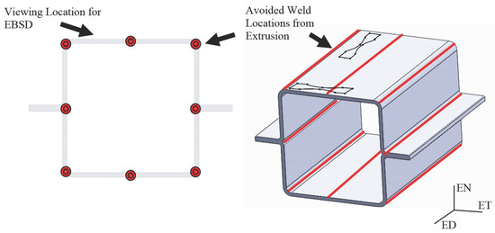 Magnesium alloy AM30 with a chemical composition (wt %) of 2.83 Al, 0.386 Mn, 0.0037 Zn, 0.03 Fe, <0.0015 Ni, <0.0005 Cu, balance Mg was the material of this study. Extrusion of the AM30 alloy was performed by Timminco. The process began with pre-extrusion to bring down the diameter of the cast billet from a 450 to 230 mm diameter cylinder through an extrusion press that ran up to a maximum pressure of 22 MPa and then pushed the 230 mm billet through the final die at 16.5 MPa. The entrance and the exit temperature were around 440 and 540 °C, respectively. The ram speed for the extrusion was about 1.3 mm s−1, while the extrusion speed was about 45 mm s−1. The extrusion ratio was 35.26:1. Lastly, the billet was extruded into the final shape, which corresponded to a hollow tube in “double-hat” like shape, known as a “crush rail” (Figure 3). This “crush rail” showed a texture that has a strong basal pole aligned with the in-plane direction of the sheet normal to the extrusion direction (extrusion traverse, or ET), and a weak basal texture component in the normal direction of the sheet (EN) (Figure 4). As such, under tension along ET (resp. EN), several grains belonging to the fiber (resp. fiber), would be subject to the formation of all six {1 0 1 2} twin variants contributing to their very large Schmid factor (0.499). While grains belonging to the (resp. fiber) fiber will experience favorable conditions for slip mechanisms to take place exclusively and perhaps {1 0 1 1} twins if enough stress is attained.