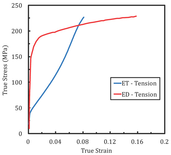 Stress-strain relationship of AM30 alloy in extrusion and extrusion transverse (ET) directions. A sigmoidal curve for tension along the ET direction indicates high strain hardening, which is characteristic of profuse tension twinning, while tension along the extrusion direction (ED) alludes to deformation due to slip with minimal twinning [36] (with the permission of Elsevier, 2020).
