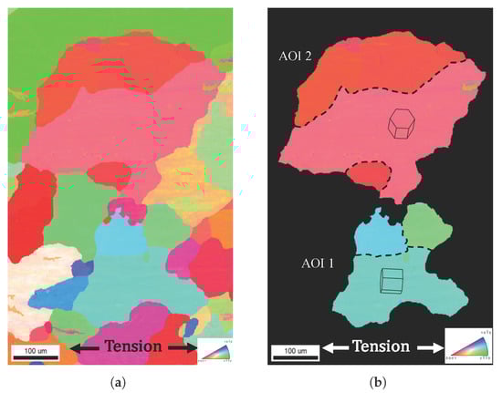 (a) Inverse pole figure (IPF) map generated through electron backscatter diffraction (EBSD) scans showing initial microstructure of Mg AM30 before deformation and (b) the highlighted partitions of the areas of interests (AOI 1 and AOI 2) with discrete unit crystal orientations that are the focus of study.