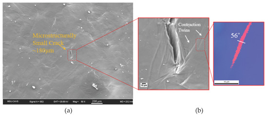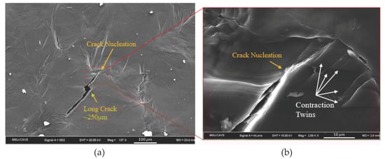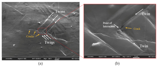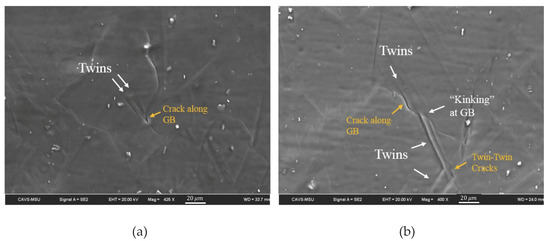 - In situ electron backscatter diffraction (EBSD) and scanning electron microscopy (SEM) micrographs revealed the importance of the twin–slip, twin–GBs, and twin–twin interactions in the formation of large cracks inside the material. Twins nucleating under a very low macroscopic Schmid factor show a greater sensitivity to crack nucleation through these interactions.