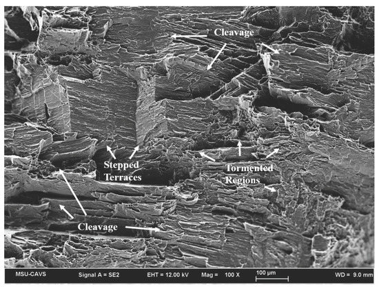Contraction twin induced damage could be explained by the inability of a slip to penetrate the hard contraction twin boundary, creating large areas of cleavage and stepped terraces within the fracture surface commonly related to brittle failure (Figure 12). The tormented areas occasionally observed in the fracture surface are attributed to slip deformation around the twin and grain boundaries and are commonly related to a ductile failure.