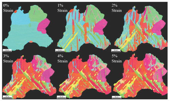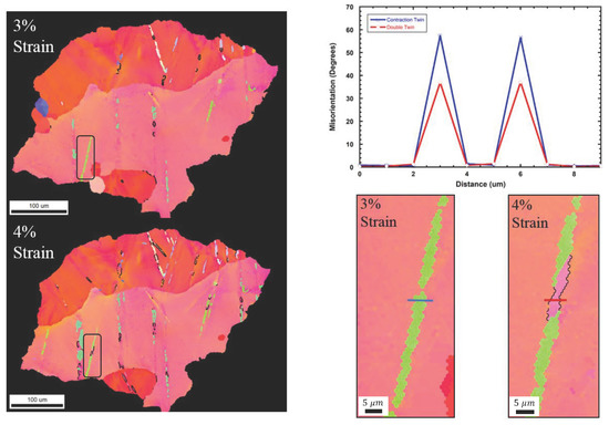 However, by 4% strain, the contraction twins have begun to experience twinning in their lattice, a phenomenon known as double twinning or retwinning. This process has been characterized at length in early literature [3,26,71,72,73,74]. Double twinning occurs when a residual twin accommodates the increasing strain by retwinning its own lattice. This process is common to an extension twin in which a compression twin nucleates [27]. The misorientation of the parent grain is not 86°, as with most tensile twins, but instead 38° ± 7° of (1 2 1 0) [5]. In Figure 19, all of the boundaries meeting the prescribed misorientations is highlighted in black.