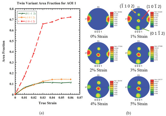 (a) Evolution of twin variant area fraction with strain for the three distinct pairs of the {1 0 1 2} system in AOI 1. (b) (0 0 0 1) pole figures showing the nucleation of three dominate twin variants forming at 1% strain then growing in intensity as the parent orientation diminishes.