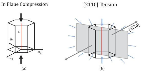 Comparison of the stress states experienced by (a) in-plane compression and (b) [2 1 1 0] tension. The representation of [2 1 1 0] tension is simplified to a two-dimensional plane stress representing the plane of maximum compression in an attempt to visualize the complexity of the stress state experienced by contraction of the ⟨c⟩-axis due to the Poisson effect.