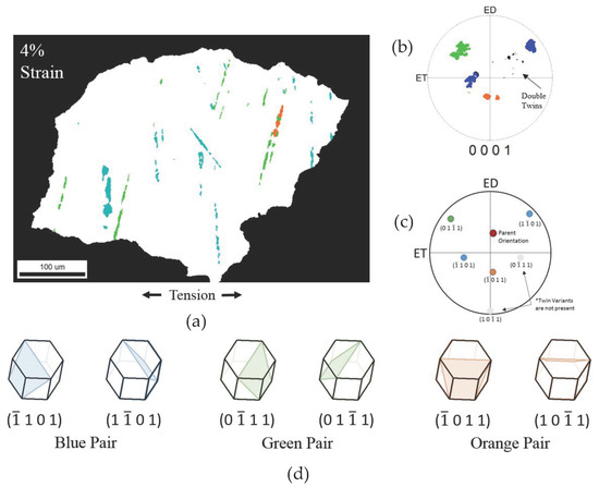 Characterization of {1 0 1 1} contraction twins at (a) 4% strain revealing continuous nucleation of new twin variants. The twins were individually selected to be partitioned from the parent grain. The texture of the partitioned twins is shown in part (b). Double twins are found among the partitioned twins. The idealized texture of {1 0 1 1} contraction twins is shown in part (c). Not all twin variants are present, but they are representatives of each twin pair. The contraction twin variants are characterized by their respective color pair highlighted in the parent grain (a), pole figures (b,c), and crystal lattice (d).