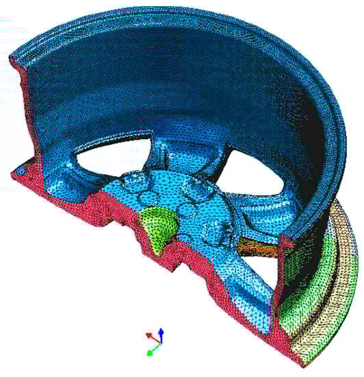 As previously described, the casting/die interface changes from an internal interface to an external interface once the die is opened and the wheel is ejected. Correspondingly, these boundaries will be in contact with environmental air, and an HTC of 20 W/(m2 K) is used together with a reference temperature of 50 °C—see Equation (5).