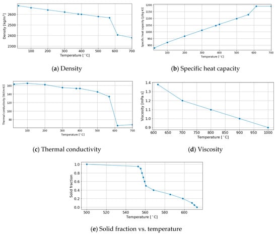 The properties of the A356 used in the model are temperature-dependent and presented in Figure 2 [18,19]. Please note that, as indicated in Figure 2e, the solidus, eutectic transformation temperature and liquidus are 500 °C, 560 °C and 614 °C, respectively. Additionally, the latent heat associated with the in-wheel solidification (the heat source term, , in Equation (3)) is calculated by Equation (4).