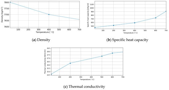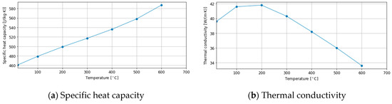 The side dies are made from 35CrMo tool steel—the Chinese designation, which is equivalent to the German designation, 34CrMo4. The chemical compositions of both alloys are given in Table 2. It can be seen that the two alloys have negligible variation in composition, and therefore, the temperature-dependent thermal conductivity and specific heat capacity of 34CrMo4 are used in the model—see Figure 4, as those of 35CrMo are unavailable [20]. For the density, data in the appropriate temperature range is not available for both 34CrMo4 and 35CrMo. However, the density of alloys will not be significantly affected by small variations in the composition of alloying elements, and thus density data for H13 is used in the model. Note: Table 2 gives the composition of H13. The comparison of the densities of H13 and 34CrMo4 at room temperature only shows an ignorable difference—less than 1%.