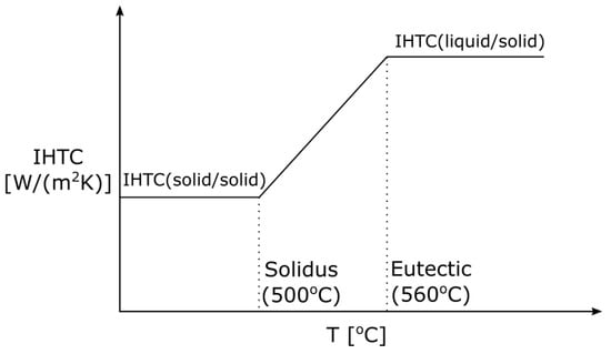 - The HTCs applied at all casting/die interfaces are temperature-dependent, following the general behavior shown in Figure 5. When the temperature is above the eutectic transformation point of A356, and the metal is fully, or mainly, liquid, the HTCs are set to relatively high values since the liquid metal is in close-to-perfect contact with the die. In contrast, when the temperature is below the solidus and the wheel is fully solidified, the contact degrades, resulting in lower values of HTCs due to the formation of solid/solid interfaces. Depending on the interface location, it is possible for a gap to form between the casting and the die surface, which leads to lower HTC values. In the region between the eutectic transformation point and solidus, the HTCs are assumed to vary linearly.