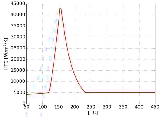 Water Cooling—Heat transfer associated with the water cooling in the cooling channels is one of the most important, but most complicated and dynamic, phenomena occurring during the LPDC process. Production-derived data indicates that boiling of the cooling water occurs at both the water-on and -off stages—refer to Part I of this study [17]. To incorporate boiling and its effect on heat transfer, the method described by Moayedinia [11] is used to calculate the cooling channel HTCs. An example of the relationship used in the model is presented in Figure 6. When the temperature is relatively low, no boiling occurs, and heat is extracted by forced convection. The HTC varies in a range between 4200 and 5000 W/(m2 K), dependent on the flow rate, diameter of the channel and temperature-dependent properties of the water. At interface temperatures above ~120 °C, the water in the cooling channels at the interface starts to boil. Note: the channel pressure is >1 atm. These bubbles agitate the boundary layer between the fluid and die, resulting in enhanced heat transfer—i.e., increases in the HTC. Peak heat transfer is predicted to occur at approximately ~160 °C. Above ~160 °C, interface contact gradually becomes reduced due to the formation and expansion of large vapor bubbles at the interface, and the HTC drops. Above ~240 °C, the HTC is assumed to be constant at 5000 W/(m2K). The reference temperature for the water-cooling boundary conditions, , is set to 50 °C, which is based on the average temperature change measured in the cooling water.