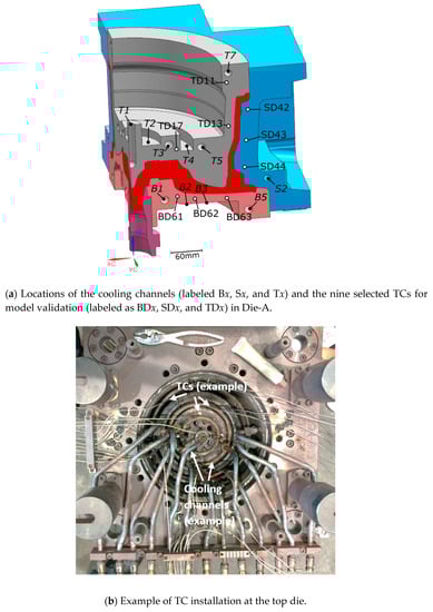 Locations of the cooling channels and TCs (a), and the photo showing the TC installation at the top die (b).