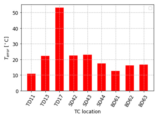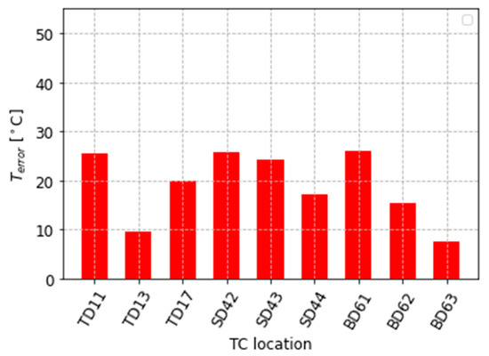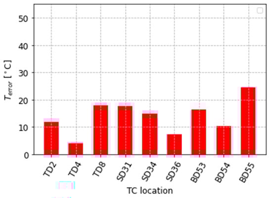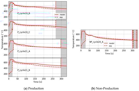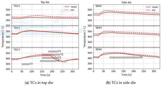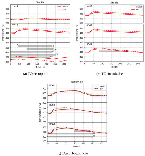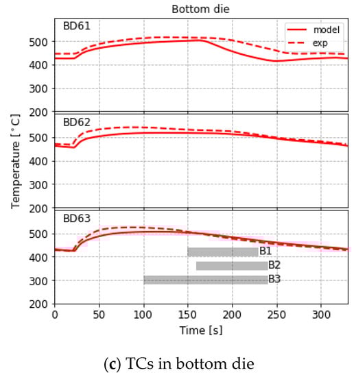 Production Process Condition—For the production process condition, Figure 8a–c present the in-die temperature comparison between the model and measured data at the TC locations in the top, side and bottom dies, respectively. Note: the cooling timings of the active cooling elements in each die component are also illustrated in the figures by the grey bars. In addition, the averaged error between the modeled and measured temperature data has been calculated by Equation (8) and displayed in Figure 9.