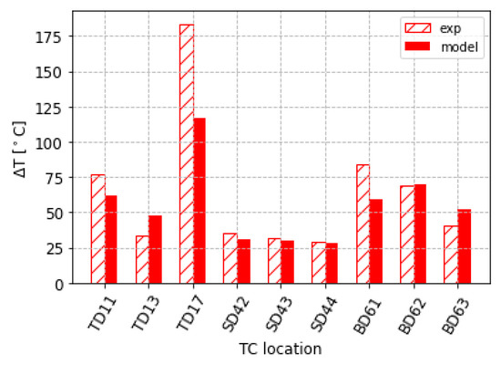 where ∆Ti (K) is the difference in temperature between the production and non-production temperatures at time index i and N is a large number (300), representing the number of sub-increments the casting cycle time has been divided into. This has been done for both the TC data and for the model output at the TC locations. The results are presented in Figure 12 and indicate that the temperature difference between the two process conditions examined ranges from 30 to 90 °C, for most of the TC locations. At these locations, the differences based on the model predictions are in relatively good agreement. At TD17, however, a much larger average temperature difference in the process data is observed (~ 185 °C), whereas the model predicts this difference to be ~120 °C—a mismatch of approximately 65 °C. This mismatch is large and warrants a closer look.