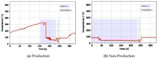 TD17 was located very close to the water-cooling channel T3, which was instrumented with a TC (TD21)—refer to reference [17] Section 4.1.4 for the details related to the instrumentation of water-cooling channels. The results for TD21 for the production and non-production process conditions are presented in Figure 13a,b, respectively. Note: the water-on and air-purging periods are marked by the light purple and green bars, respectively, in the two figures. The major difference between these two sets of data is that, in the production process condition, the residual water remaining after air purging is fully vaporized and the channel dries out (after ~280 s). The “dry out” is indicated by the rise in temperature to well in excess of 100 °C, which continues through into the next casting cycle until the water-cooling is reactivated, whereas in the non-production process, the residual water in channel T3 is not fully vaporized (the temperature within the cooling channel remains just below 100 °C). Thus, the extended cooling time applied to channel T3 has had a secondary effect, in that by cooling the die to a larger extent, residual water is retained in the channel. Consequently, the period over which boiling occurs during the water-off period for the channel is extended from ~40 to ~90 s, leading to the large ∆Tavg observed in Figure 12. This effect is not currently captured within the model, hence the model under-predicts the effect of extending the cooling timing in channel T3. It also points to the need to fully understand the cooling/boiling behavior in the water channel during and after air purging.
