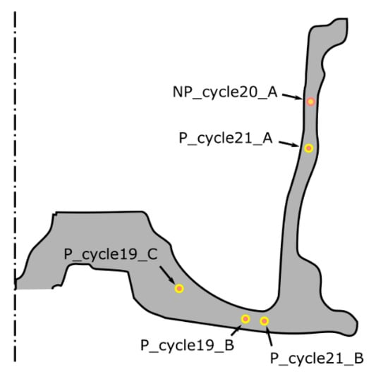 From the comparison, it can be seen that, overall, the model-predicted in-wheel temperatures follow the profiles of the measured data relatively well. The poorest agreement is observed for locations P_cycle21B and P_cycle19B, both of which are located in the spoke near the rim–spoke junction. In P_cycle21B, the error is approximately 50 °C at the end of the cycle. As can be seen, the model and experimental data both reflect the latent heat release associated with primary α-aluminum solidification at approximately ~600 °C and eutectic formation at ~560 °C, as evidenced by periods of reduced rates in temperature decline—see reference for solidification sequence [19].