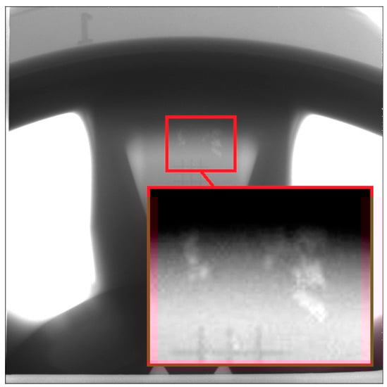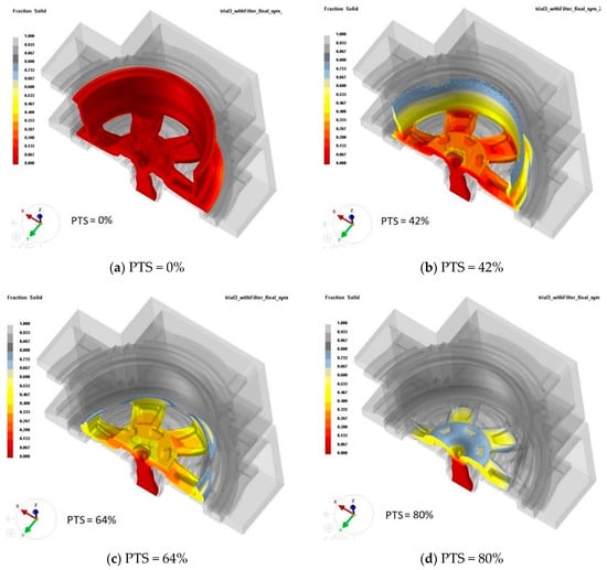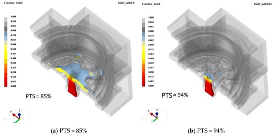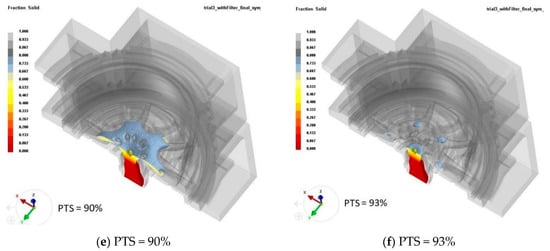 Turning to the non-production process condition, only the stages with the formation of liquid encapsulation are presented in Figure 18 for brevity. It can be seen that liquid encapsulation formed in two regions: the rim/spoke junction at PTS = 85%, and the spoke/hub junction at PTS = 94%. The former is ~27 mm in equivalent radius, whereas the latter has a similar location and size (~16 mm in equivalent radius) to that predicted in the production process condition wheel. Compared to the X-ray radiography results [17], Figure 19, with the larger area of liquid encapsulation predicted by the model, indicates consistency. This lends some support to the conclusion that the other smaller areas of liquid encapsulation yielded porosities below the detection limit.