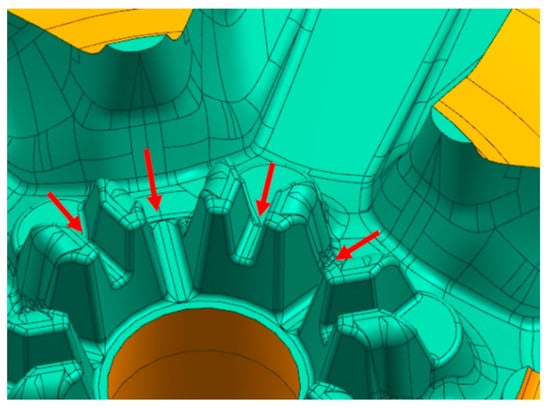 Focusing first on the production process condition, Figure 16 presents a series of images (a–f) of the wheel within the die at increasing times within the cast cycle. In each image, the portion of the wheel with a solid fraction, fs, greater than 0.7 is removed or “cut-off” in the image, thereby allowing the progress of the solidification front within the die to be observed. As can be seen in the series of images, in general the solidification front follows a path from the upper die (in-board rim flange) to the sprue. Small volumes of liquid encapsulated (~18 mm in equivalent radius) can be seen at the spoke/hub junction in image (f), at PTS (percentage of total solidification) = 93%. A close-up view of the bottom die structure in the vicinity of the area of liquid encapsulation is shown in Figure 17. As can be seen, the structure of the die is complex, resulting in a large surface area for heat transfer per volume of material undergoing solidification, likely leading to the formation of the region of encapsulation. As presented in Section 4.1.5 in reference [17], no noticeable shrinkage-based porosity was observed in the area in question from the line-of-sight X-ray images taken of example wheels cast under the production process condition in a cyclic steady state. This indicates that either the model falsely predicted the area of liquid encapsulation, or alternatively the size of the porosity was below the threshold for detection in the X-ray imaging system used.