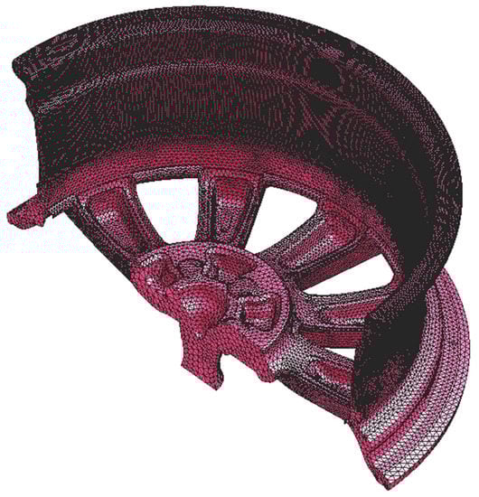 Wheel geometry and mesh (469,100 2D elements and 2,896,039 3D elements) used for additional model validation (Die-B).