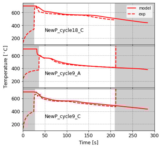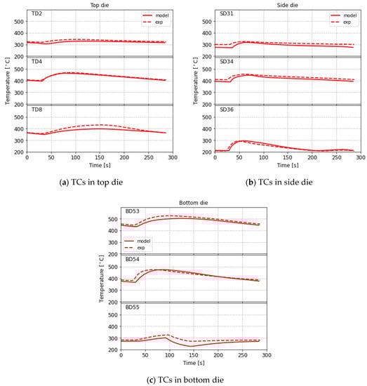 A closer look at the comparison shows that relatively large discrepancies appear at two locations, TD17 and BD61, and are both approximately 50 °C in magnitude at their maximum. They also both occur only in the third stage of the temperature evolution. As the third stage, characterized by cooling, is dependent on the activation of water-cooling elements, it is therefore speculated that the boundary conditions in the model describing the water cooling are responsible. Firstly, the effect of boiling has been included; however, its description is still simplified, and secondly, there is a delay between the time when the cooling water valve opens and when the water actually arrives at the in-die channels—see the details in Sections 4.1.2 and 4.1.4 of reference [17]. However, considering that one major aim of this work is to standardize the model parameters for extensive industrial use, and given that the delay varies from channel-to-channel, the cooling timings in the model were not adjusted relative to the programmable logic controller (PLC) set values to improve the fitting.