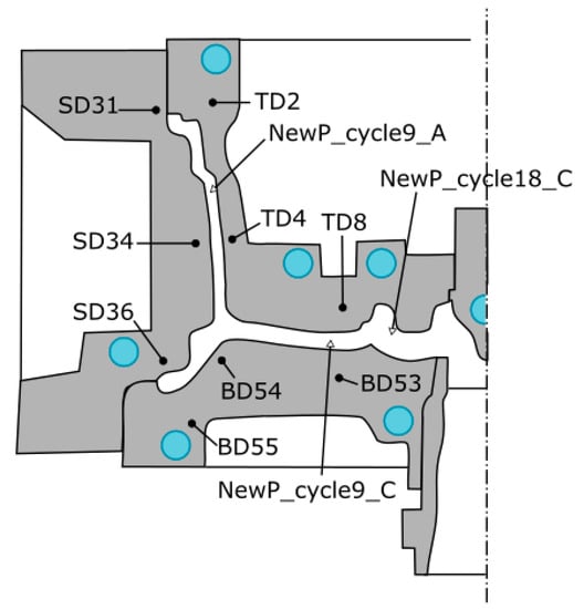 The temperature evolution with time within the wheel at multiple locations was also examined in this work, which provides an opportunity for a direct validation of the model with respect to the thermal phenomena occurring during the solidification process. Figure 14a,b present a comparison between the in-wheel temperature measurements and the model predictions for the production and non-production process conditions, respectively. The in-wheel TC locations are shown in Figure 15. Those locations labeled with a P are for the production process condition and those labeled with an NP are for the non-production process condition. Note that there was only one successful insertion of a TC into the die cavity for the non-production process condition. It should be mentioned that these are challenging measurements to make, and that the TCs have to be inserted by hand into the die cavity and are prone to be cut when the die closes. There are two periods of time in which the data from the TCs should be disregarded: the first is at the beginning of the cycle prior to the liquid contacting the TC, and the second is at the end of the cycle when the TC is cut prior to the ejection of the wheel from the top die. In the figures, these periods are highlighted in light gray for clarity.