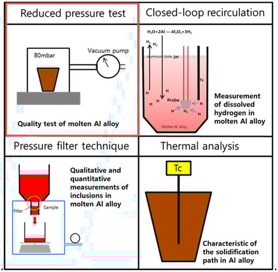 Schematic representations of main evaluation methods used for the determination of Al melt quality in the literature (reduced pressure test indicated by red lined square was used in this study).