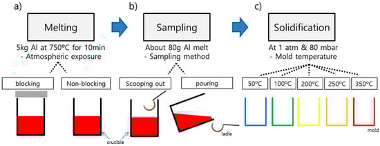 The Al-Si alloy used in this study is Al-10Si-Mn-Mg (Silafont-36, Ajinmetal, Ulsan, Korea) and has the chemical composition detailed in Table 1. To standardize quantifiable evaluation of Al melt quality, the reduced pressure test was conducted under the three casting experimental conditions (atmospheric exposure, sampling method, and mold pre-heating temperature). Figure 2 and Table 2 summarize the casting conditions and sampling methods that this study adopted. Five kilograms of Al10SiMnMg ingot was melted by electric resistance furnace. Melt temperature was maintained at 750 °C for 10 min, and each casting condition was tested.