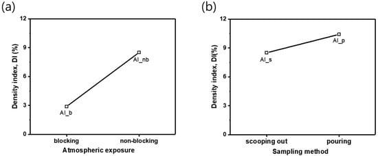 Density index of (a) Al-Si alloy melted with two different atmospheric exposure and (b) Al-Si alloys collected by two different sampling methods.