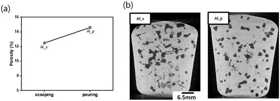 Figure 4 shows the porosity and X-ray CT images of Al_s and Al_p tested at the reduced pressure. The porosity of Al_s and Al_p was 12.5 and 14.6%, respectively, and, similarly to the difference in DI between the two samples, the porosity of Al_s was 2.1% lower. And X-ray CT images displayed that, while the pores formed in Al_s crowded in the upper area, the pores in Al_p were evenly distributed. It is interpreted that the pouring method used for Al_p than the scooping-out method for Al_s produces more oxides and intermetallic compounds that allow nucleation of pores; and it leads to a different distribution of the pores.