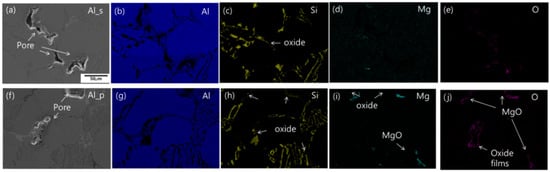 Figure 5 shows the images of the reduced pressure test samples Al_s and Al_p observed by scanning electron microscopy and energy dispersive spectroscopy. With them, the oxides and inclusions formed around the pores in the samples were comparatively analyzed. In Al_s, Si oxides were found to form around the pores, and, in Al_p, Mg oxides, as well as Si oxides, were observed. While casting Al-Si alloys, adding a small amount of Mg may produce oxides, such as MgO and MgAl2O4, in the form of film []. SiO2 oxides, with a density of 2.66 g/cm3 that is close to that of Al, are likely to be spread throughout the melt; but MgO and MgAl2O4 have densities at 3.58 g/cm3 and 3.6 g/cm3, respectively, which is higher than Al melt, so that they are likely to stay in the lower area of the crucible. It is interpreted that the sample Al_p collected by pouring contained more oxides of higher density and consequently produced significant differences in Al melt quality and DI.