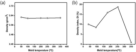 (a) Density of Al-Si alloys cast at 1atm (1.01 × 103 mbar) and (b) density index of Al-Si alloys cast in the mold pre-heated to the temperature of 50, 100, 200, 250, and 350 °C.